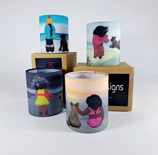 A design of woman and her best friend sitting on the beach on a beautiful Donegal sunset printed on bamboo fabric .Hand made cute tealight holder which comes in a presentation box and with a battery led tealight included.