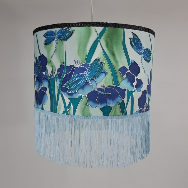 A hand painted silk lampshade with fringing and braiding