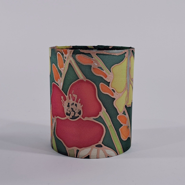 "Hedgerow" a glimpse of the flora of the hedges which surround us in beautiful Donegal. Hand painted on pure silk and made into a cute tealight holder which comes in a presentation box and with a battery led tealight included.