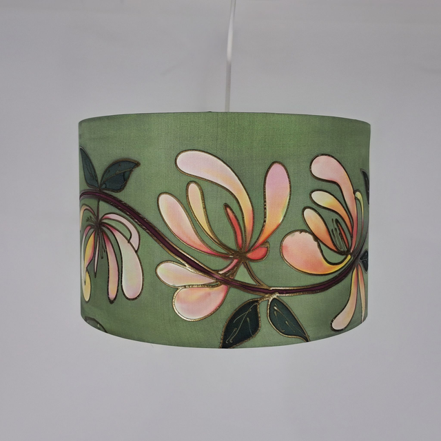 This silk shade in the "Honeysuckle" design is made from hand painted silk which is steamed to make colourfast, washed, pressed and constructed into this shade.