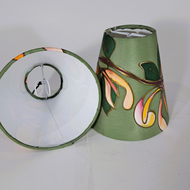 The silk is hand painted and steam fixed to make it colour fast and then used in the hand made shade which is white inside with special coating used in lampshade making.