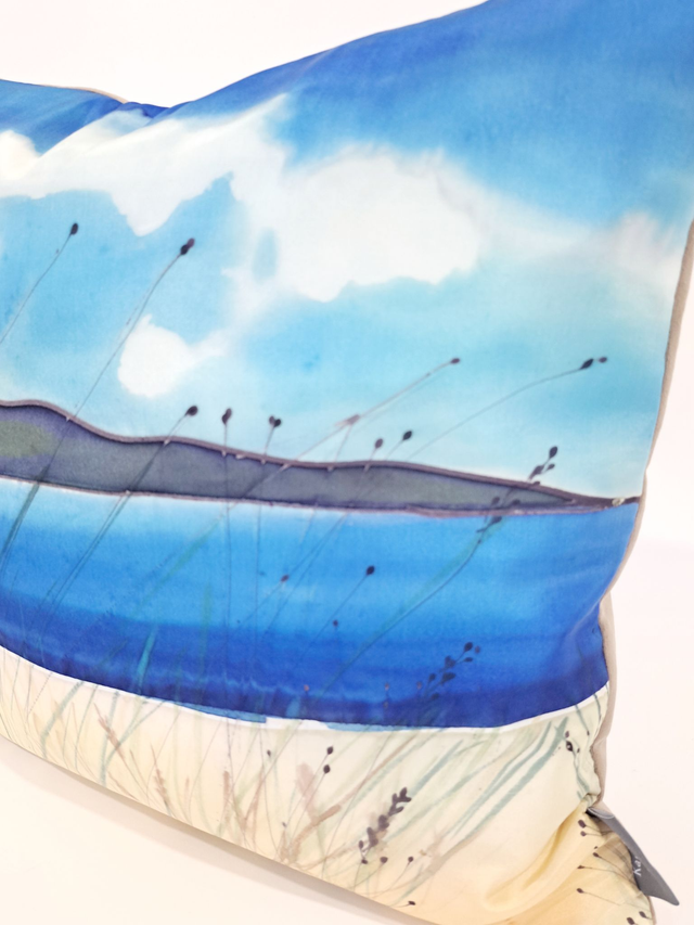Add a bit of luxury to your home with this silk cushion made from a silk painting of a Donegal beach by Irish textile artist Karen O'Kane.