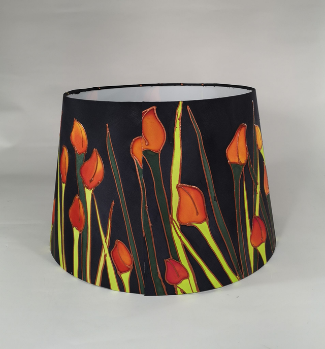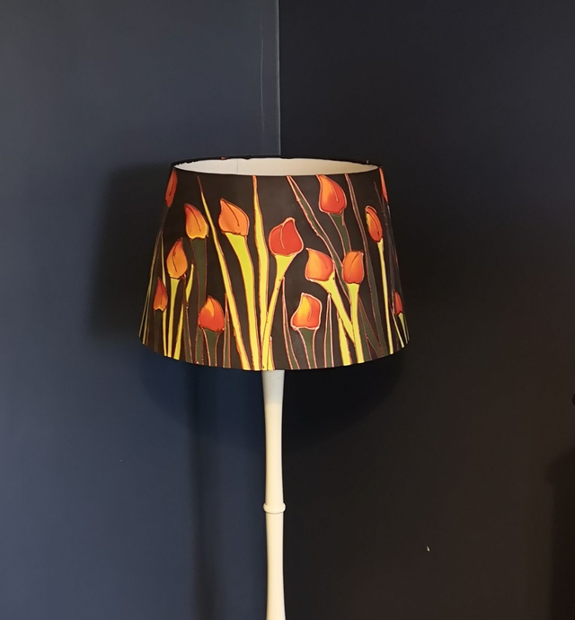 The silk is hand painted and steam fixed to make it colour fast and then used in the hand made shade which is white inside with special coating used in lampshade making.